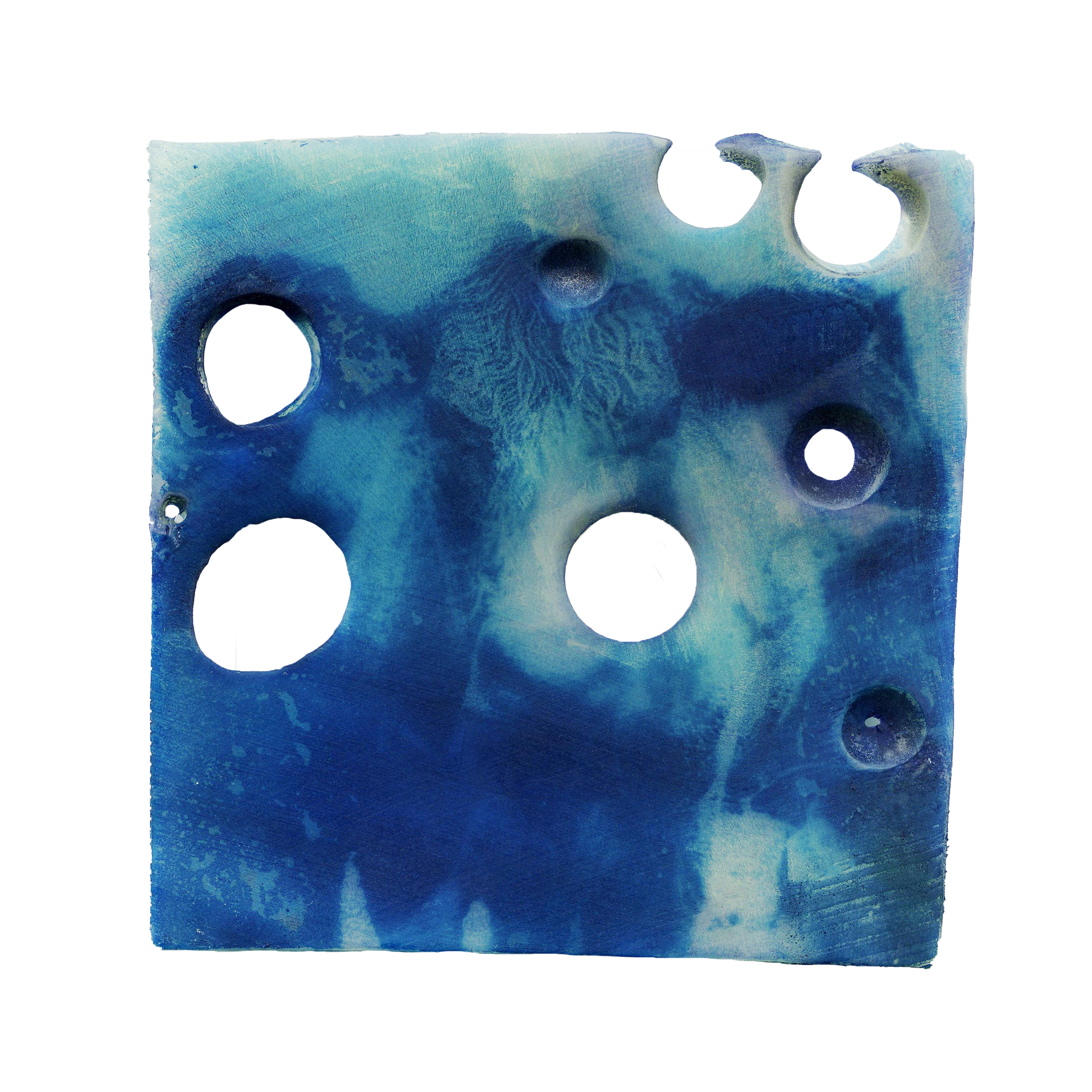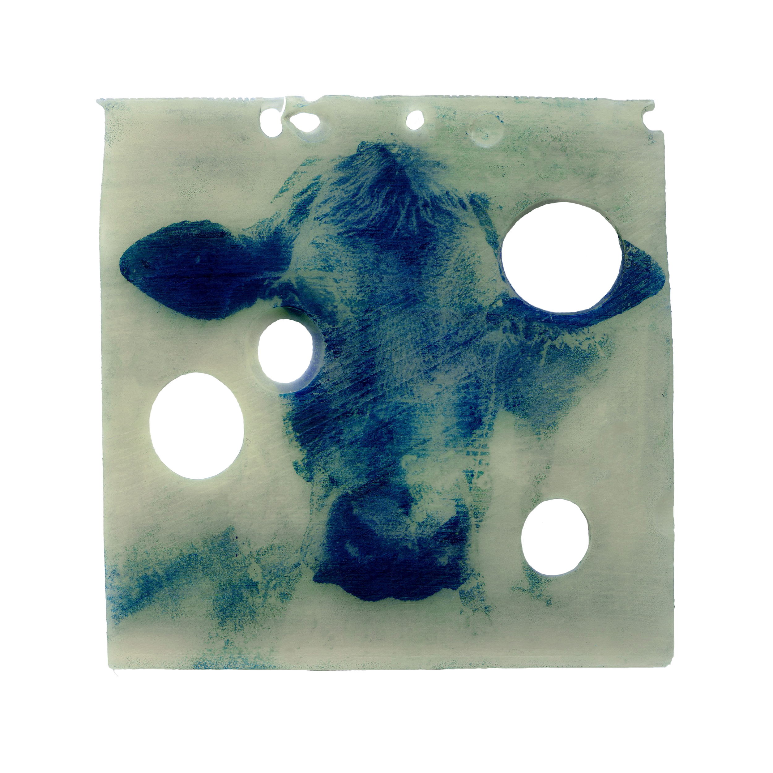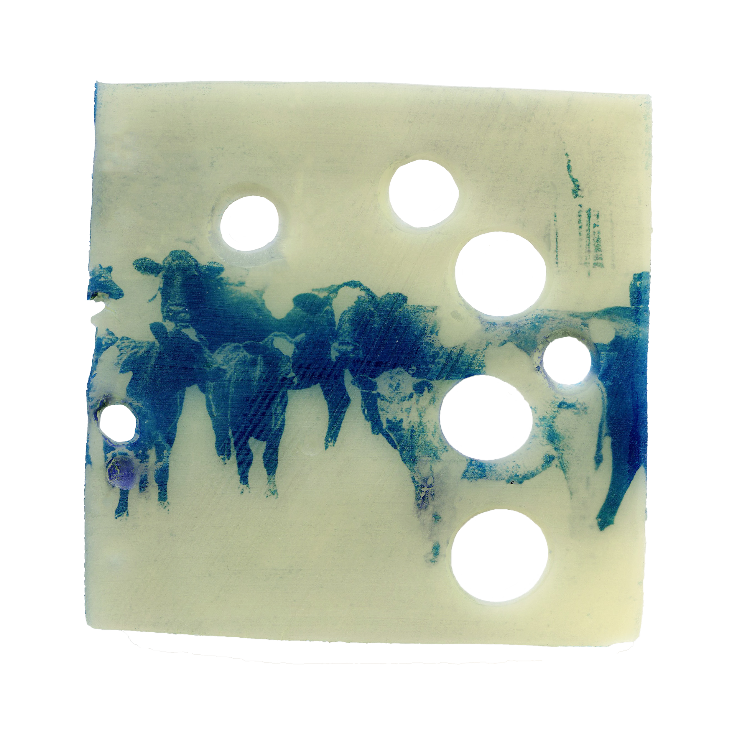 throughout history cyanotypes have been used on many different natural materials. when prompted to create cyanotypes on anything but paper or fabric, I took it as an opportunity to try something completely crazy. after many hours of trial and error I was able to create nine fully developed images of cows printed directly onto slices of swiss cheese.